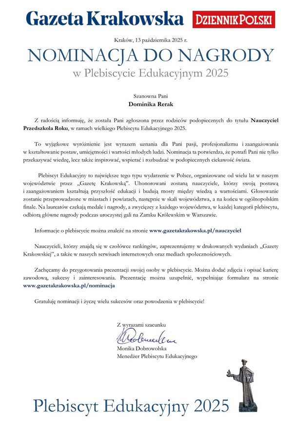 Harmonogram uroczystości przedszkolnych w I semestrze: 15.09.2025 Dzień Kropki 19.09.2025 Dzień Przedszkolaka 15.10.2025 Pasowanie na Przedszkolaka 06-10.10.2025 Plener Jesienny dla dzieci (data zależna od pogody) 24.10.2025; 28.11.2025; 12.12.2025 Dogoterapia 07.11.2025 Szkoła do hymnu 14.11.2025 warsztaty muzyczne 20.11.2025 Międzynarodowy Dzień Praw Dziecka 25.11.2025 Światowy Dzień Pluszowego Misia 04.12.2025 Spotkanie ze Św. Mikołajem 15-19.12.2025 Kiermasz Świąteczny 16 - 17.12.2025 Spotkanie przedświąteczne z Rodzicami |